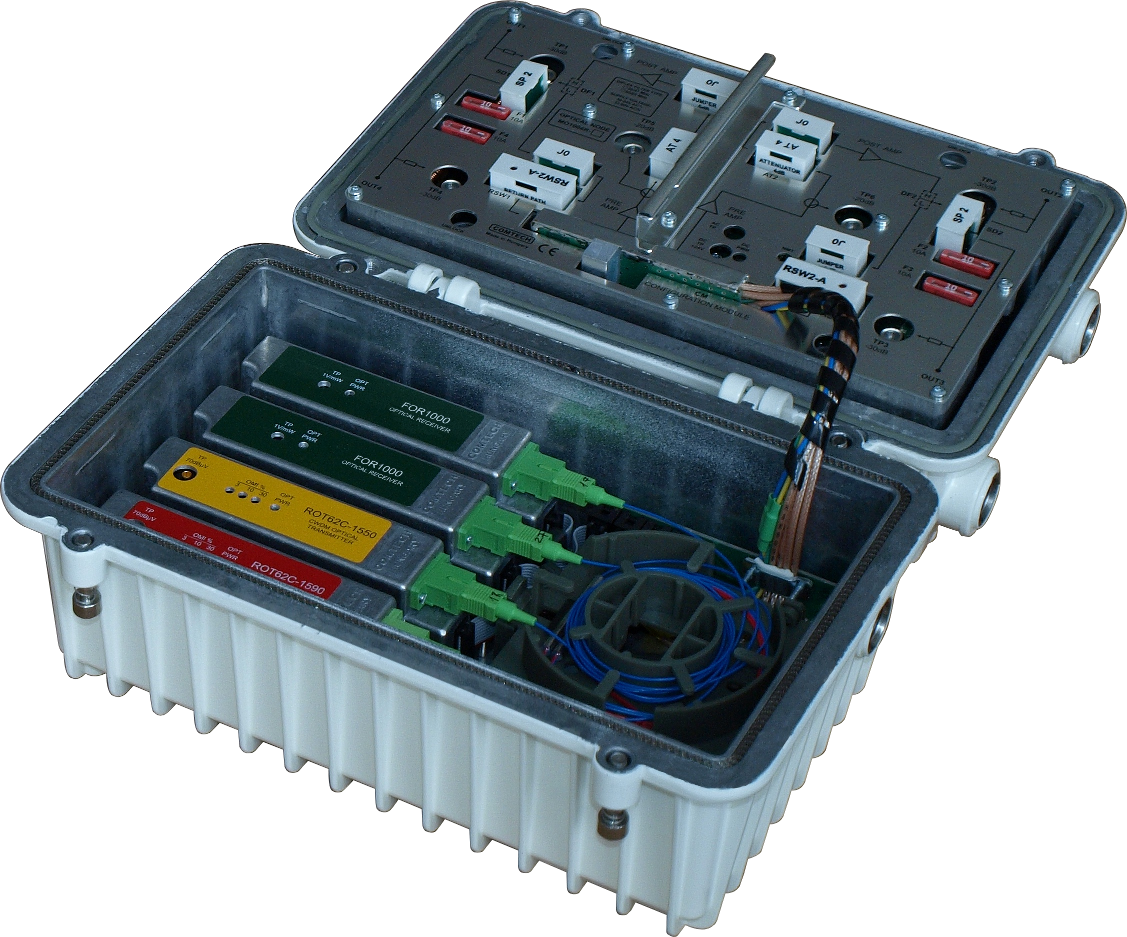 This optical node can contain 2 receiver and 2 transmitter modules and allow several configurations depending on the used CM module. First configuration is 2 fully independent nodes in a common housing with common powering and management to achieve cost-effective work in case of segmenting both signal directions. Second configuration offers redundant work in both signal directions. Partial segmentation can be realized with 1 receiver and 2 transmitter modules, while the fourth configuration is a standard node with 1 receiver and 1 transmitter. By changing the CM module the configuration of the device can be modified without high expenses. The MO1004 node is available with either for HFC or for Fiber Deep network optimized circuitry.